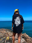A circular wooden top (1m x 1cm), carefully sanded, patched, and hand-painted. At the end sealed with a glossy epoxy layer. The base is a custom metal structure.